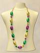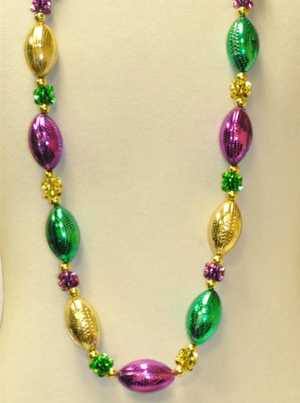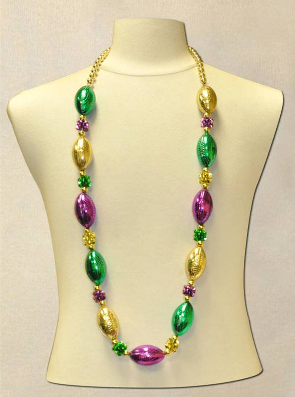 Shop our hand strung purple, green and gold football necklaces with gold spacer beads. These lightwieght beads make a great Mardi Gras parade throw. 48 inches long.