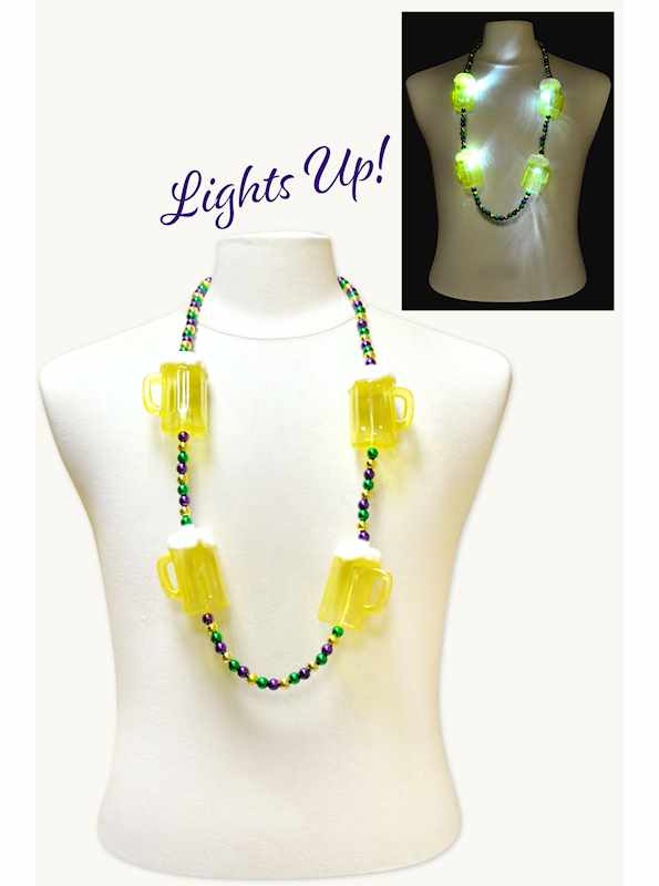 Bottoms Up! Get in the Mardi Gras spirit with four blinking LED beer mugs with festive purple, green and gold alternating beads.