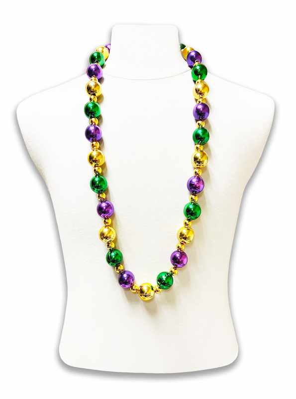 Shop our large 25MM Purple, Green and Gold lightweight beads accented with Metallic Gold Spacer beads. A highly sought after Mardi Gras throw. 40 inches long.