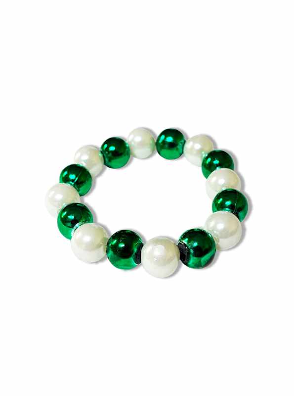 Shop our brilliant, metallic Geen and White Pearl Beaded elastic Bracelets, a sought after St. Patrick's Day Parade throw. One size fits all.