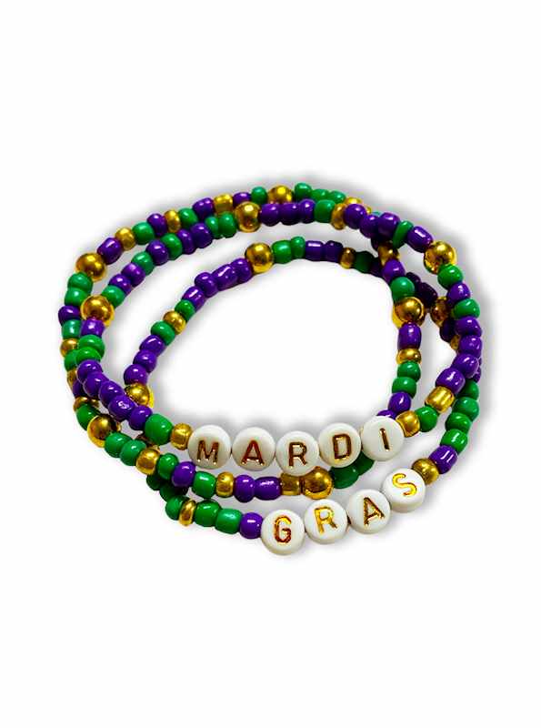 Shop our three piece Purple, Green and Gold elastic Bracelets with "Mardi Gras" Beads. A fun way to jazz up your Mardi Gras ensemble, they also make great throws! One size fits most.