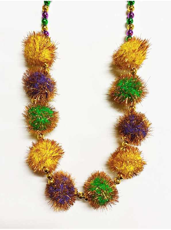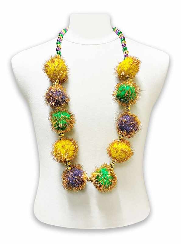 Shop our fabulous, hand-strung, flashy Tinsel Balls in purple, green and gold with matching color metallic beads. A festive accessory for Mardi Gras gatherings and a sought-after parade throw. 44 inches long.