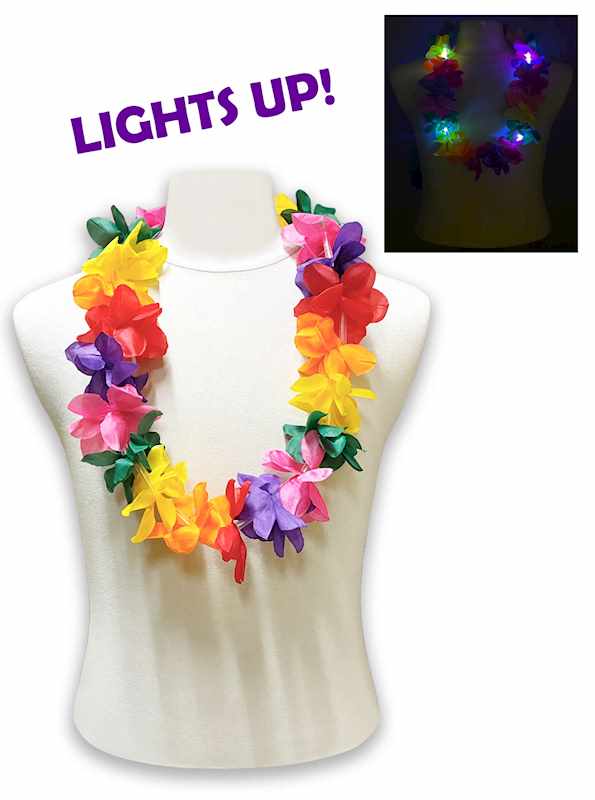 Aloha! Shop our light up red, yellow, pink, green and purple hibiscus flower leis, features three light modes and an on/off switch. Dress up your next pool party, Luau or tropical theme event. 33 inches long.