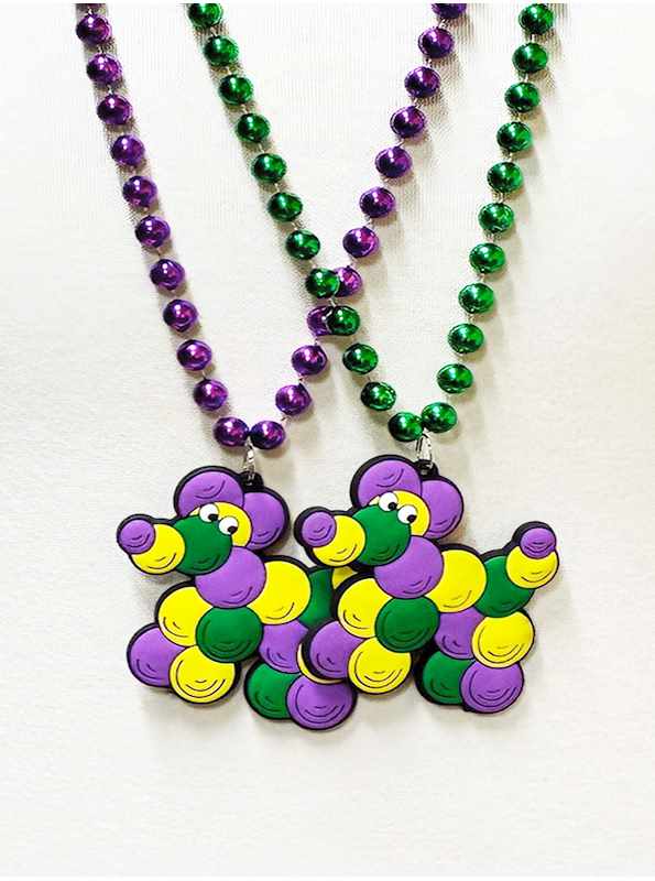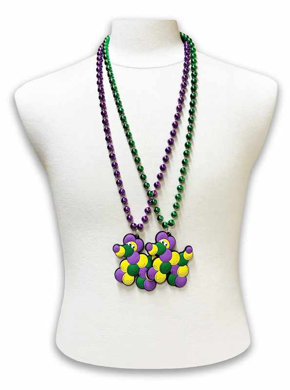 Shop our adorably, expressive purple, green and gold Mardi Gras Bead Dog Magnet Medallions on 10mm purple and green beads. 36 inches long.
