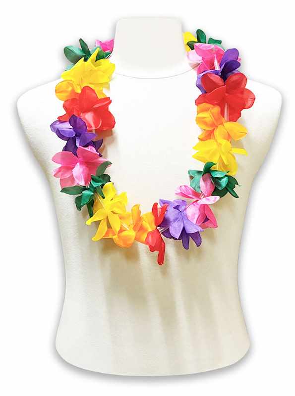 Aloha! Shop our vibrant, pink, yellow, orange,red, green and purple hibiscus flower leis. Dress up your next pool party, Luau or tropical theme event. 33 inches long.
