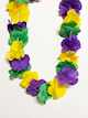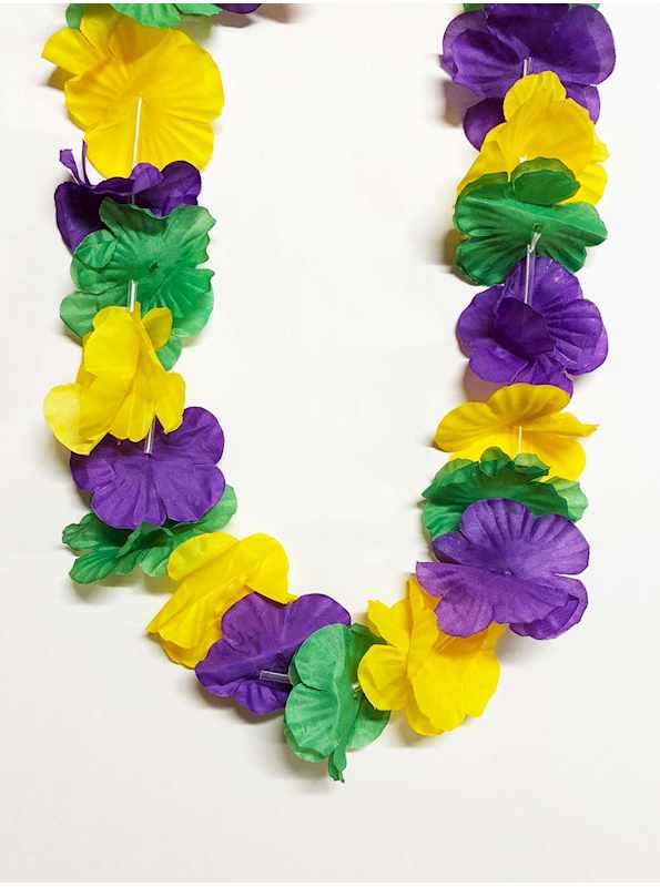 Aloha! Shop our Mardi Gras theme, purple, green and yellow hibiscus flower leis. Dress up your next pool party, Luau or tropical theme event. 33 inches long.