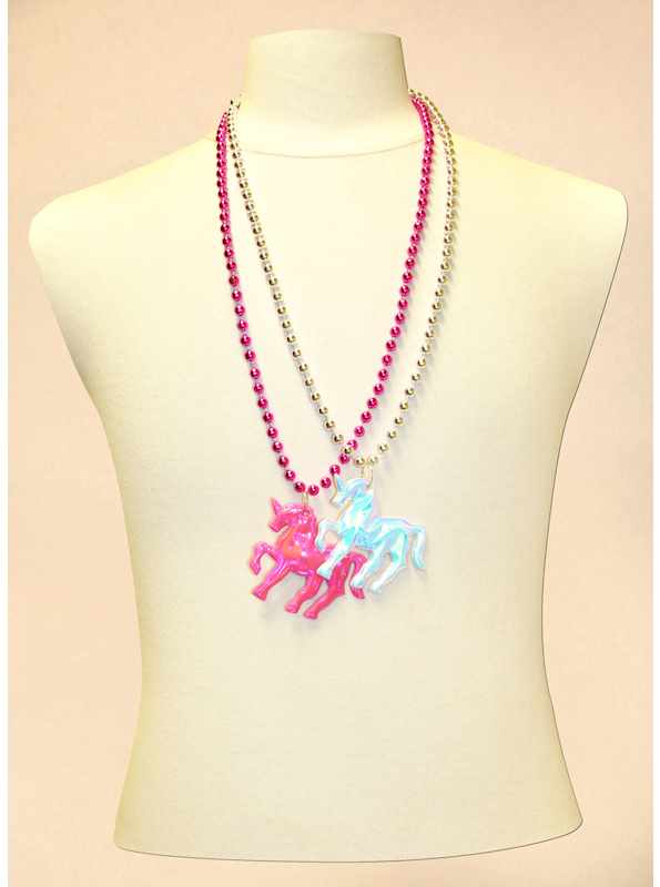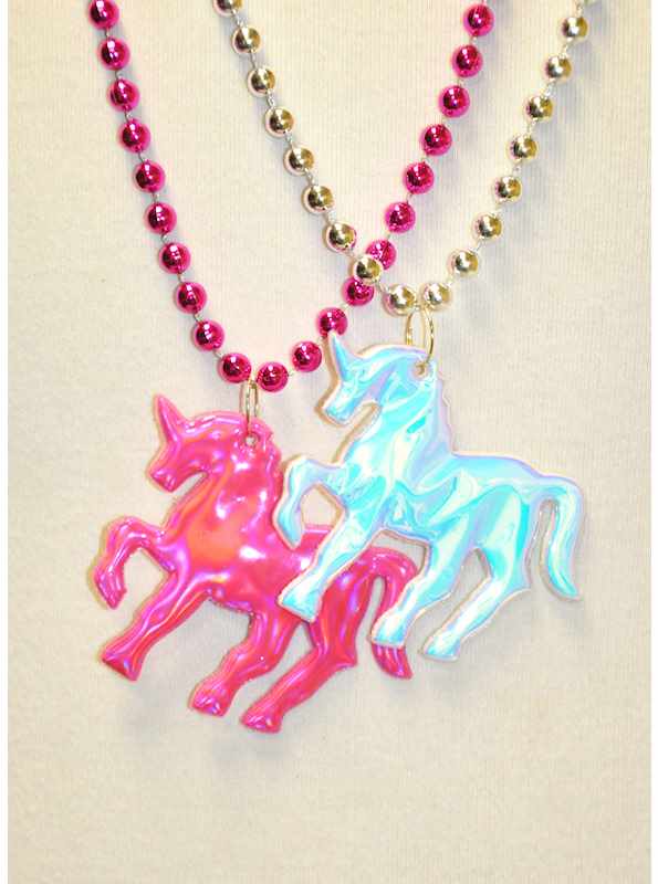 Shop our adorable, pink and silver prism unicorn medallion beads, a highly popular parade throw bead. 33 inches long.