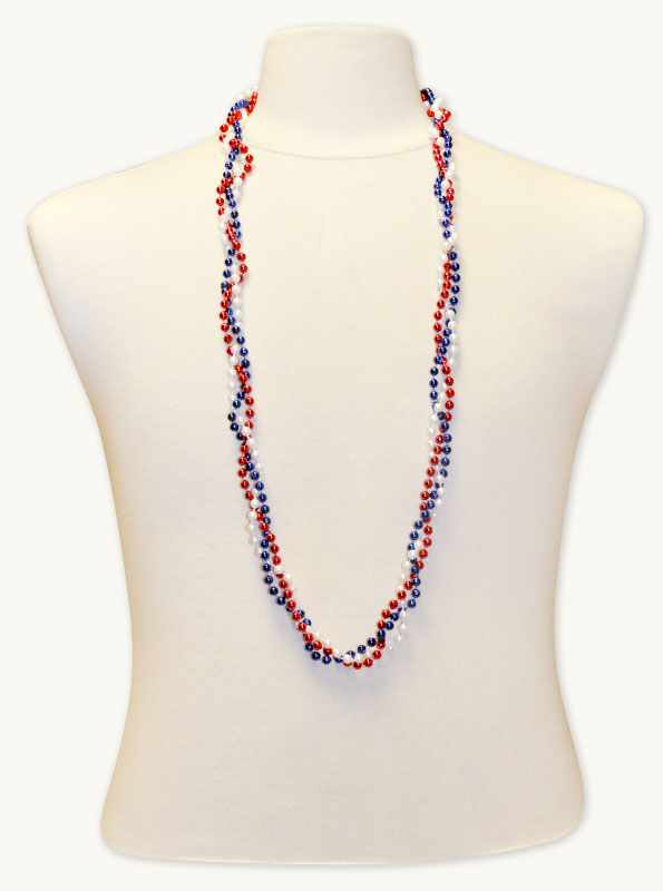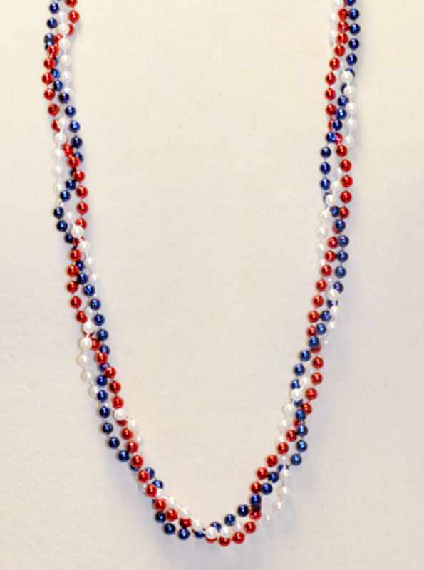 Our patriotic red, white and blue metallic twist beads are individual strands of 6mm beads braided into a single necklace. These beads are a sought-after July 4th parade throw and make a great Independence Day party favor. 39 inches long.